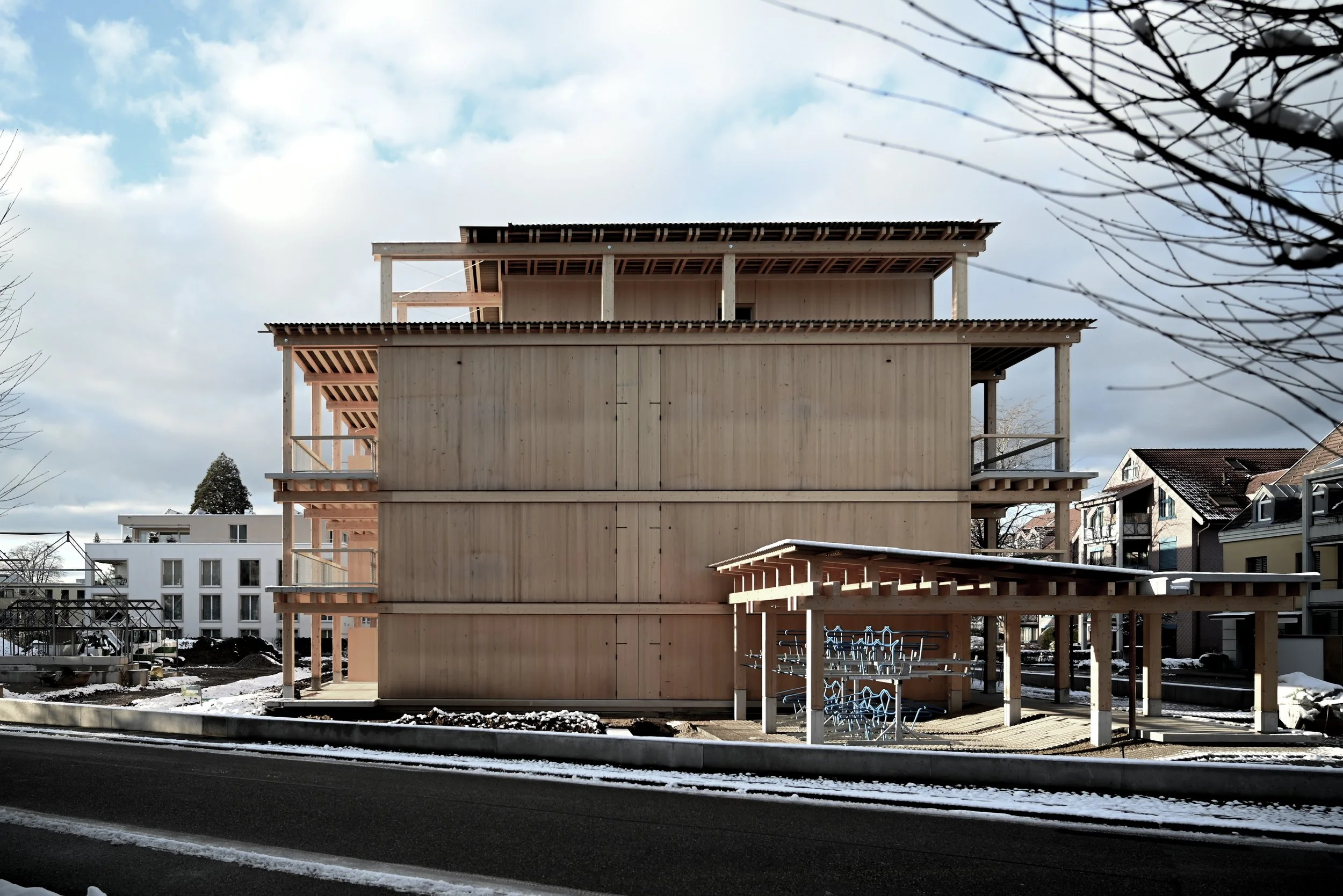 Der klare Grundriss folgt der Holzbauweise. Ein direkter Eintritt in Wohn- und Essbereich, eine Mittelzone mit Dusche und Stauraum sowie zimmerseitig zum Garten orientierte Raeume. Geschichtete Waende und Decken erfuellen Schall- und Brandschutz. Tragende Fassaden und Laengswaende uebernehmen die Lasten. Die modulare Struktur ermoeglicht unterschiedliche Wohnungsgroessen.